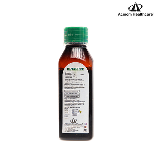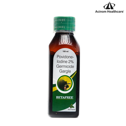 Betafree Gargle contains 2% Povidone-Iodine, an antiseptic solution that helps kill germs in the mouth and throat, providing relief from sore throat and maintaining oral hygiene with a refreshing mint flavor.